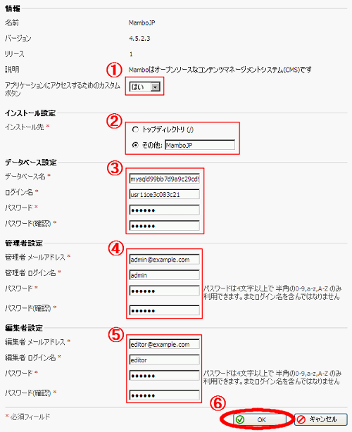 (4)、(5)ではそれぞれMamboの管理者と編集者の情報を設定します。