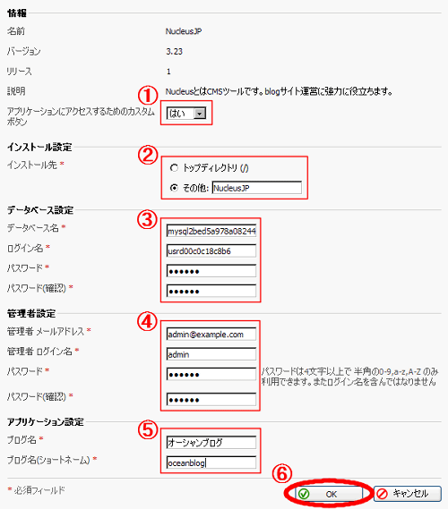 ご利用になるデータベース名とログイン名は自動的に設定されますが、