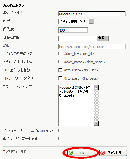 (1)はPleskコントロールパネルにNucleusへアクセスするためのボタンを作るかどうかを設定します