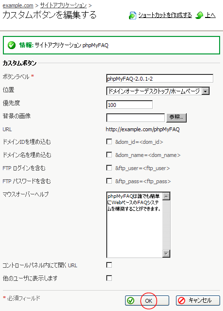 (1)はPleskコントロールパネルにphpMyFAQへアクセスするためのボタンを作るかどうかを設定します