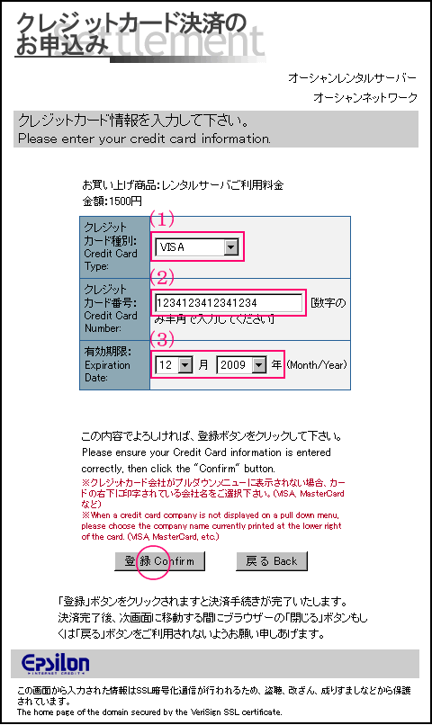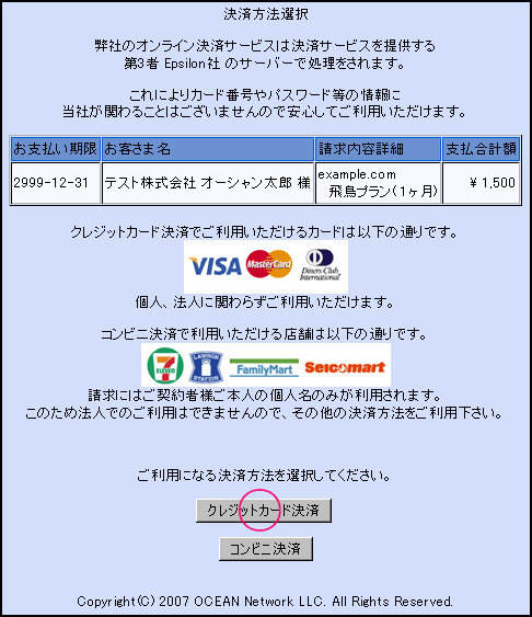お支払い料金に問題がないことを確認した後、クレジットカード決済のボタンをクリックします。