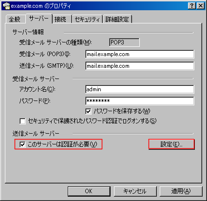 「このサーバーは認証が必要」のチェックボックスにチェックを入れ「設定」のボタンをクリックします。