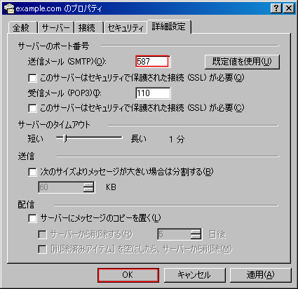 「送信メール(SMTP)」を「587」に変更します。